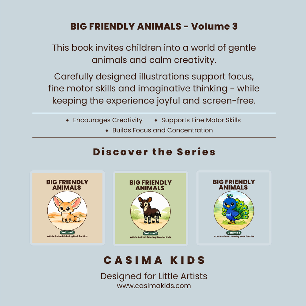 Volume 3 completes the Big Friendly Animals trilogy with the same calm visual language and kid-friendly simplicity — made to feel rewarding, consistent, and collectible as a set.